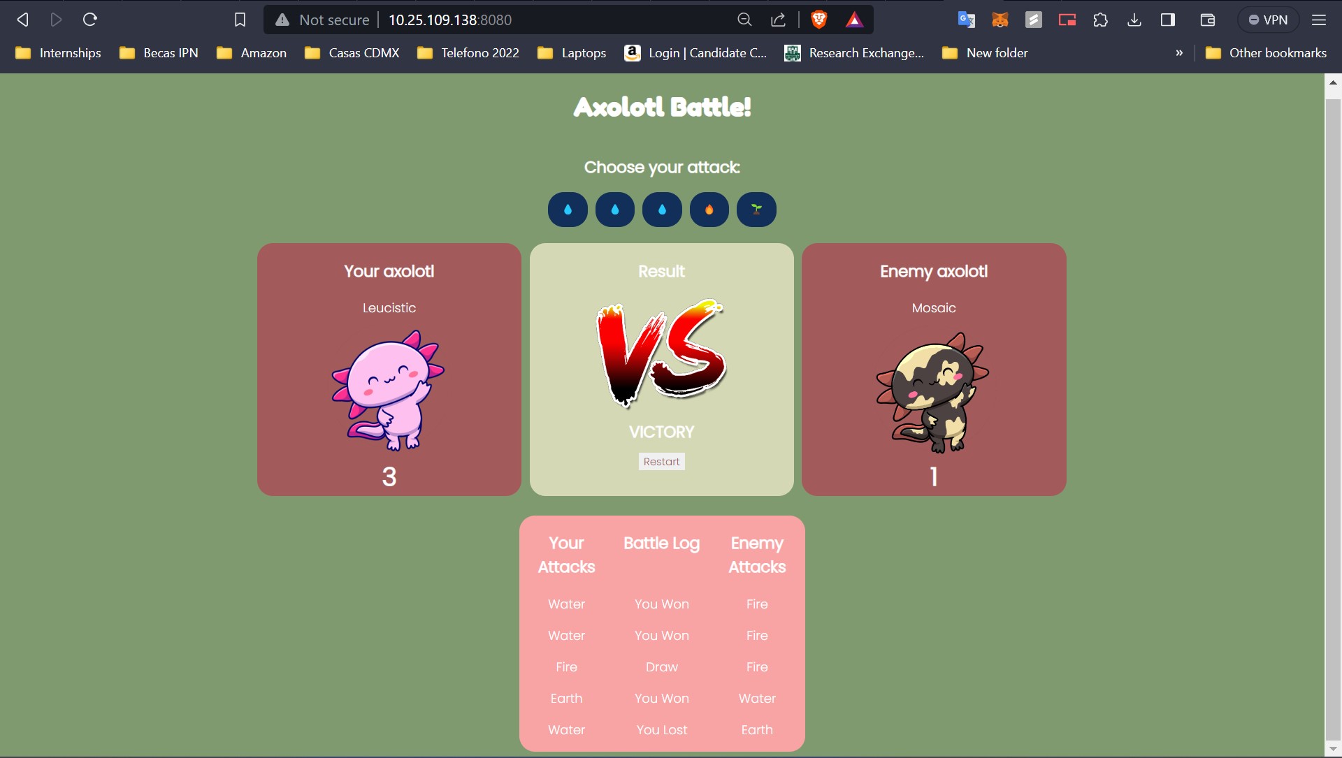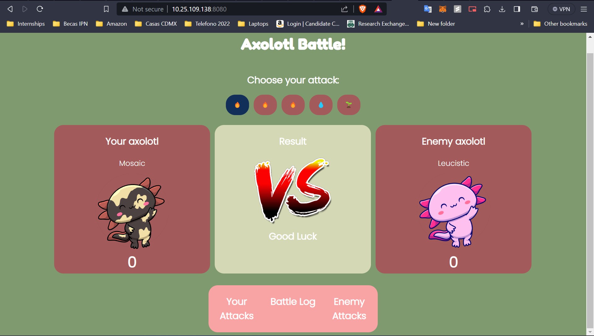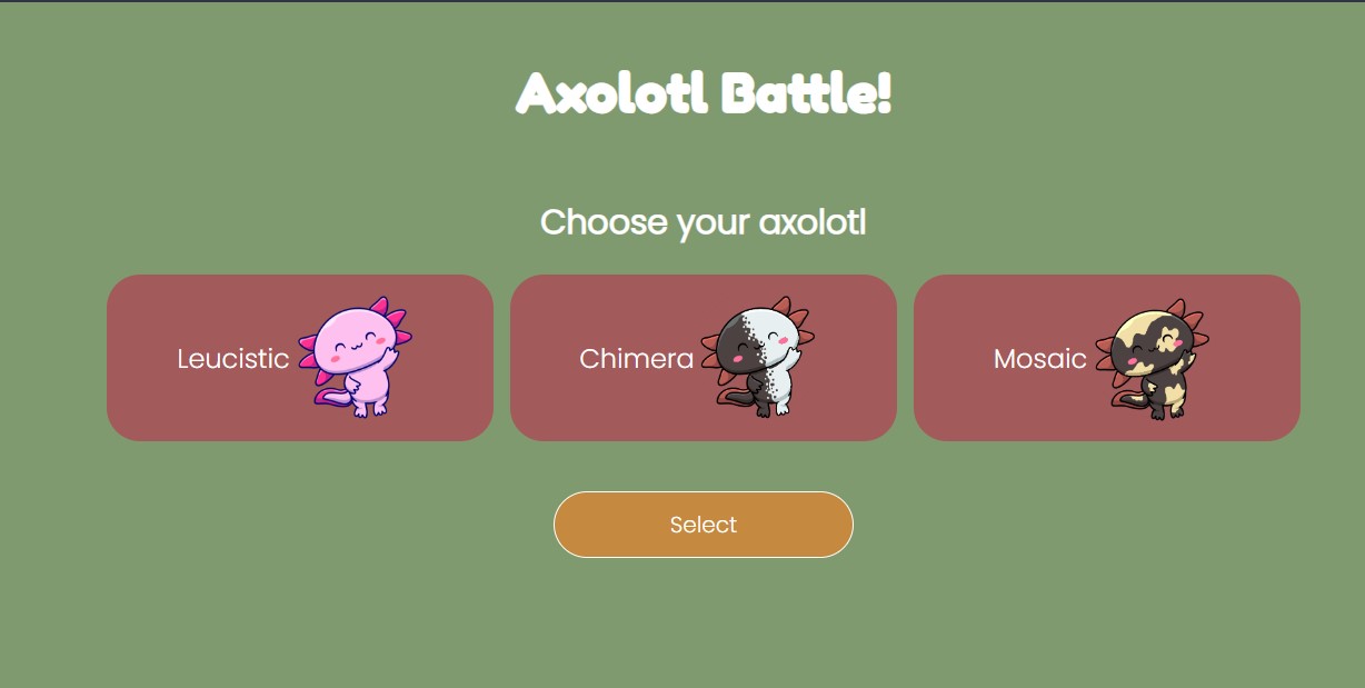 Each axolotl possesses unique elemental attacks. The outcome of the battle depends on the elements chosen by each player. After each round, the winner is awarded a point. The axolotl with the most points at the end of the game emerges as the ultimate victor. This game is a test of strategy, quick decision-making, and a dash of luck.