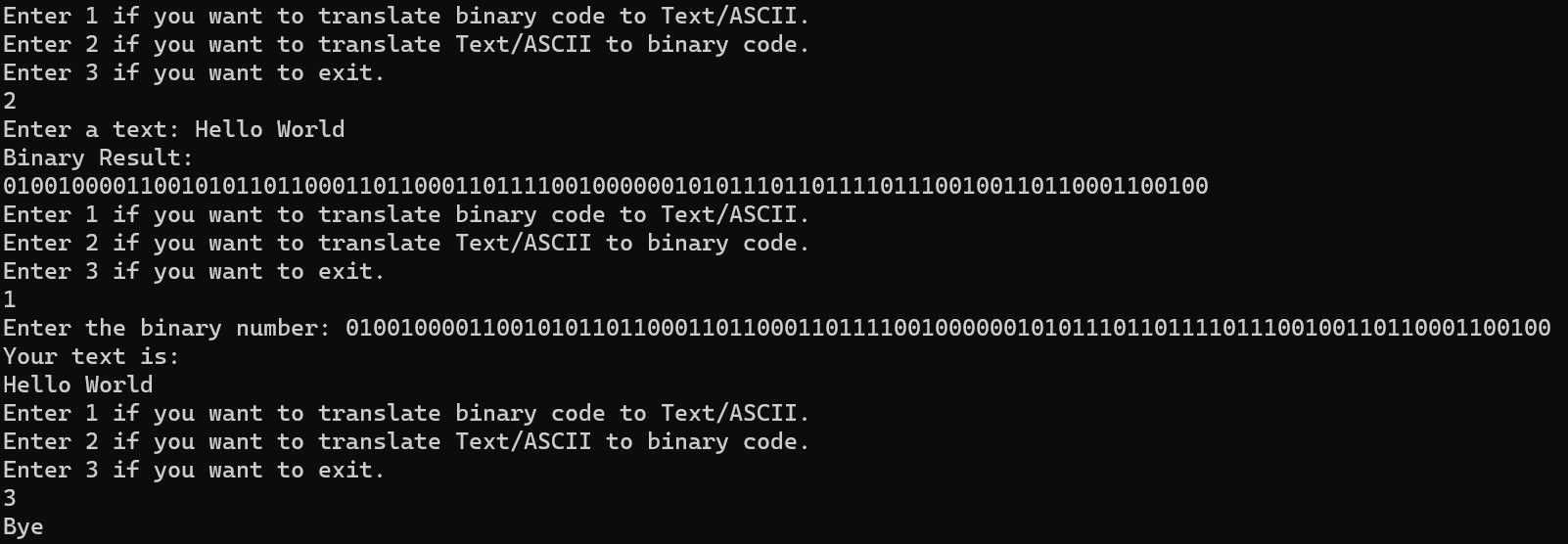 This is a project I worked on called "Binary Translator" which is a Python program that allows users to convert text to binary code and vice versa. The program takes user input in the form of either a string of text or a binary code, and then uses conditional statements and string manipulation to convert the input to its corresponding output. The binary code is represented using the ASCII code, where each letter is assigned a specific sequence of 0s and 1s.
