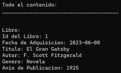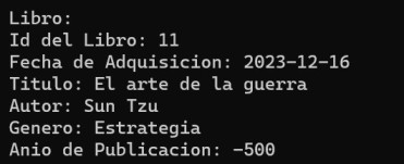 The first option allows you to view the entire contents of the library. As observed in the previous image, we can see various important aspects of a book. This image is just one in a list. The program begins with the initial 10 books and magazines, but you have the ability to add and modify this collection. It's important to note that magazines have different characteristics than books.