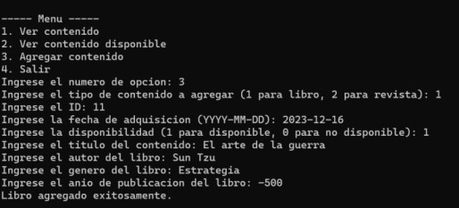 The second option displays the available content in the same format. The third option allows you to add content. An interactive menu will guide you through the process of adding information step by step. For example, if you want to add a book or a magazine, the menu will prompt you for the respective characteristics of each, depending on your choice. Once you've added the item, you can view it when you display the available items or all items.